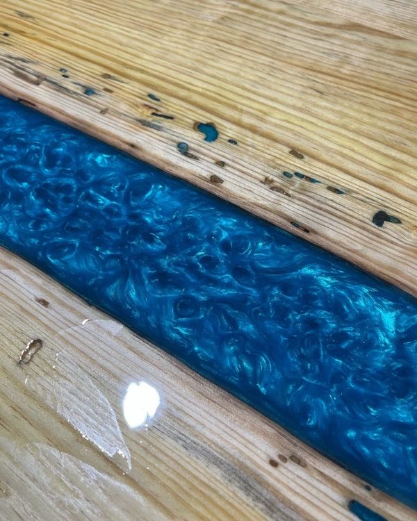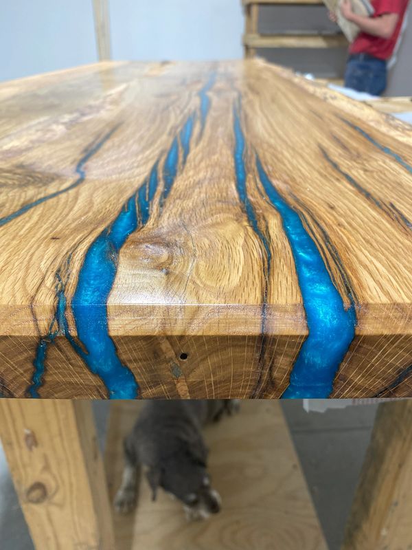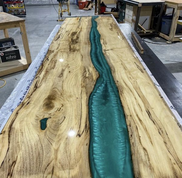 This tree came from a local family. We split this board and poured green epoxy to form a long lasting counter.